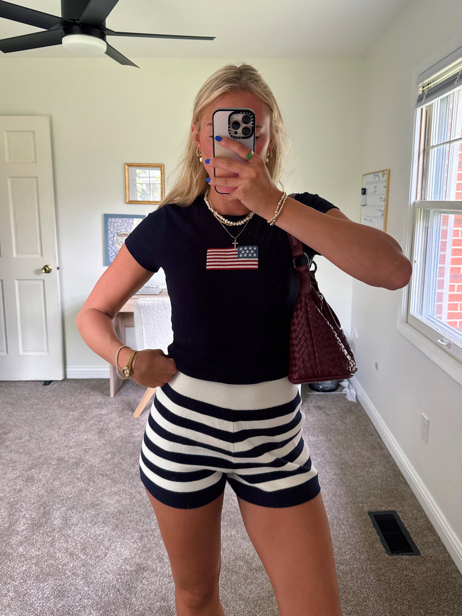 Navy Embroidered American Flag baby tee! Fits true to Size. Lily is 5'7" and is wearing a Size Small. Materials are 95% Cotton and 5% Spandex.