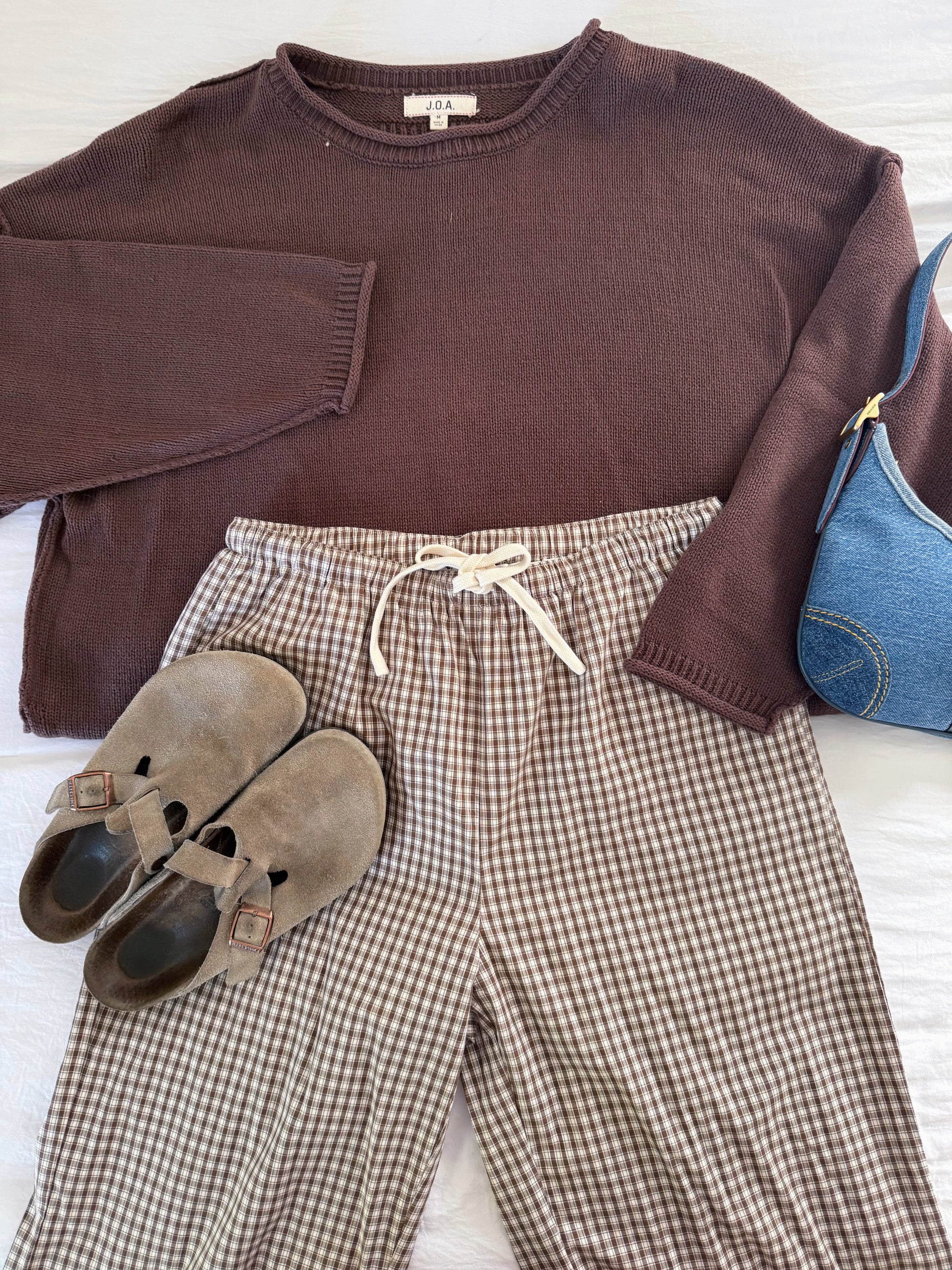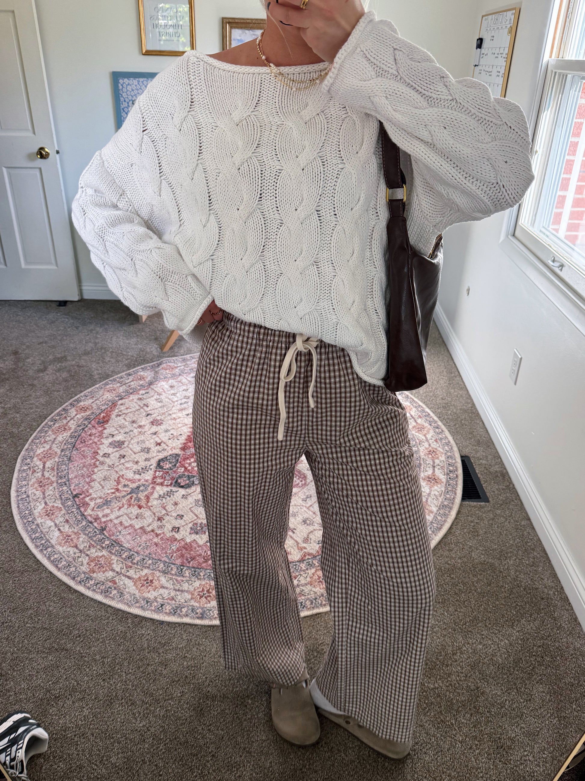 Brown and Cream checkered plaid pants! Includes adjustable drawstring. Runs true to size. Lily is 5'7" and is wearing a Size Medium.