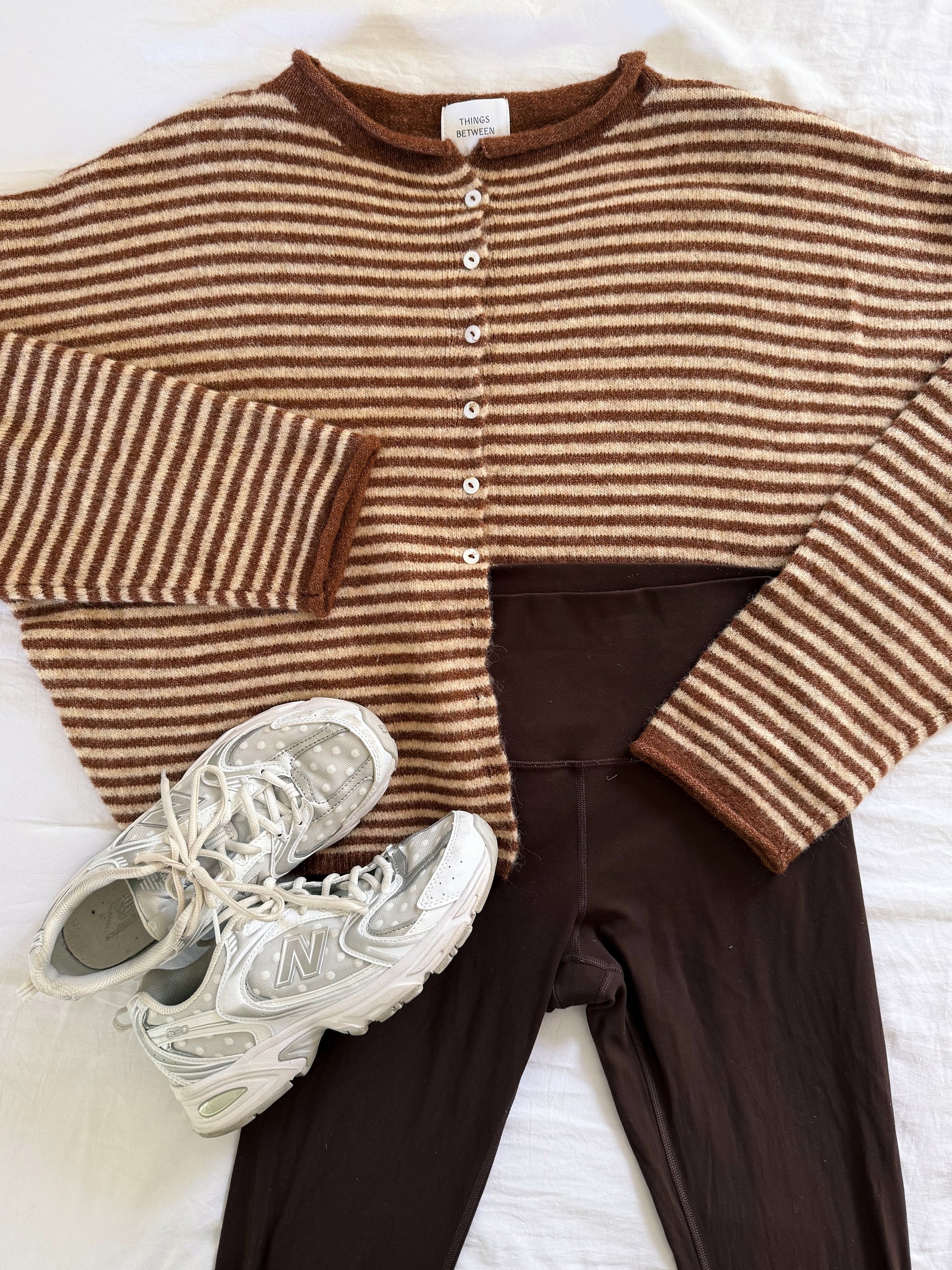 Light Brown and Cream Button Up Striped Cardigan Sweater! Runs slightly Oversized. Lily is 5'7" and is wearing a Size Small.