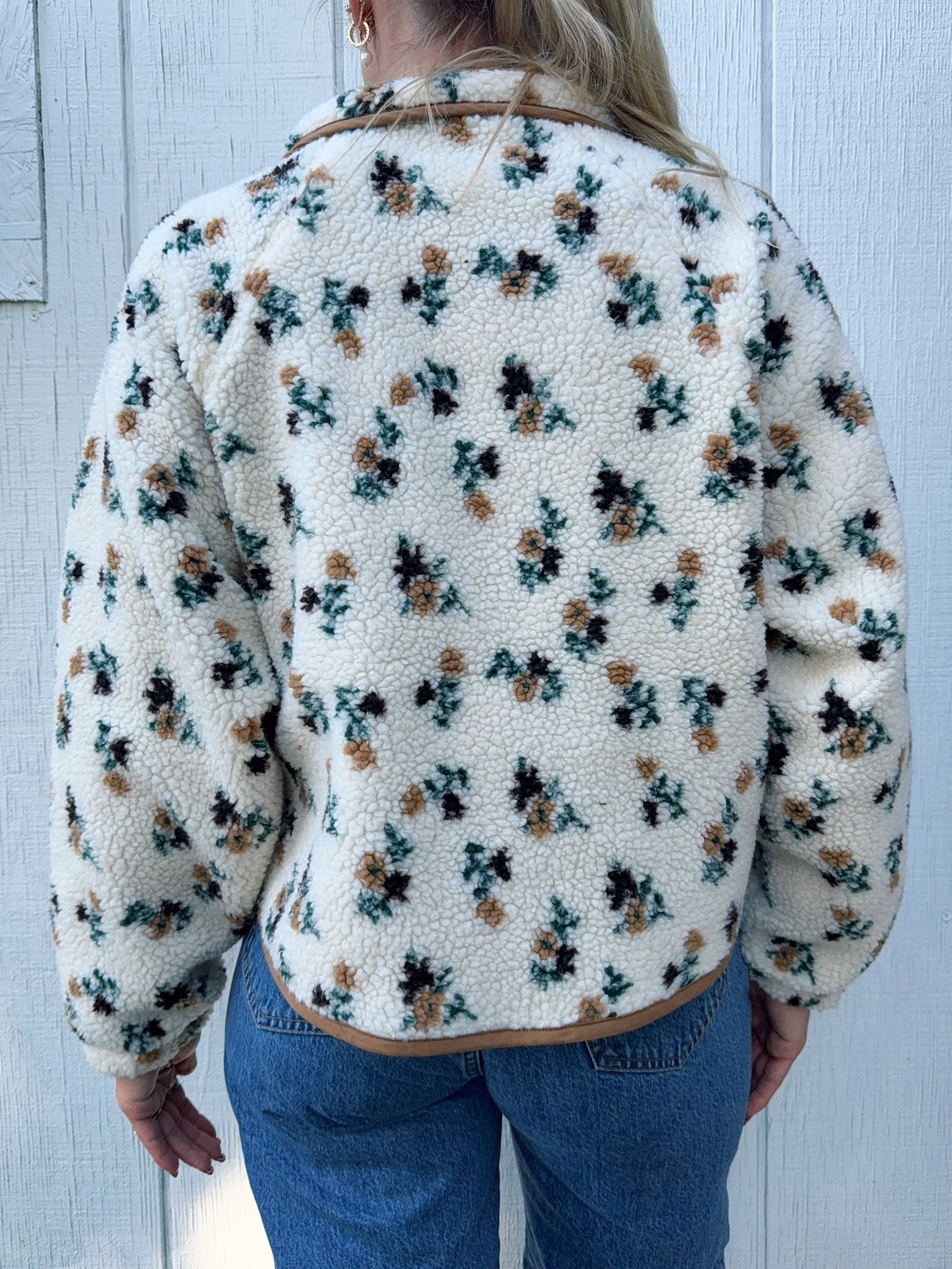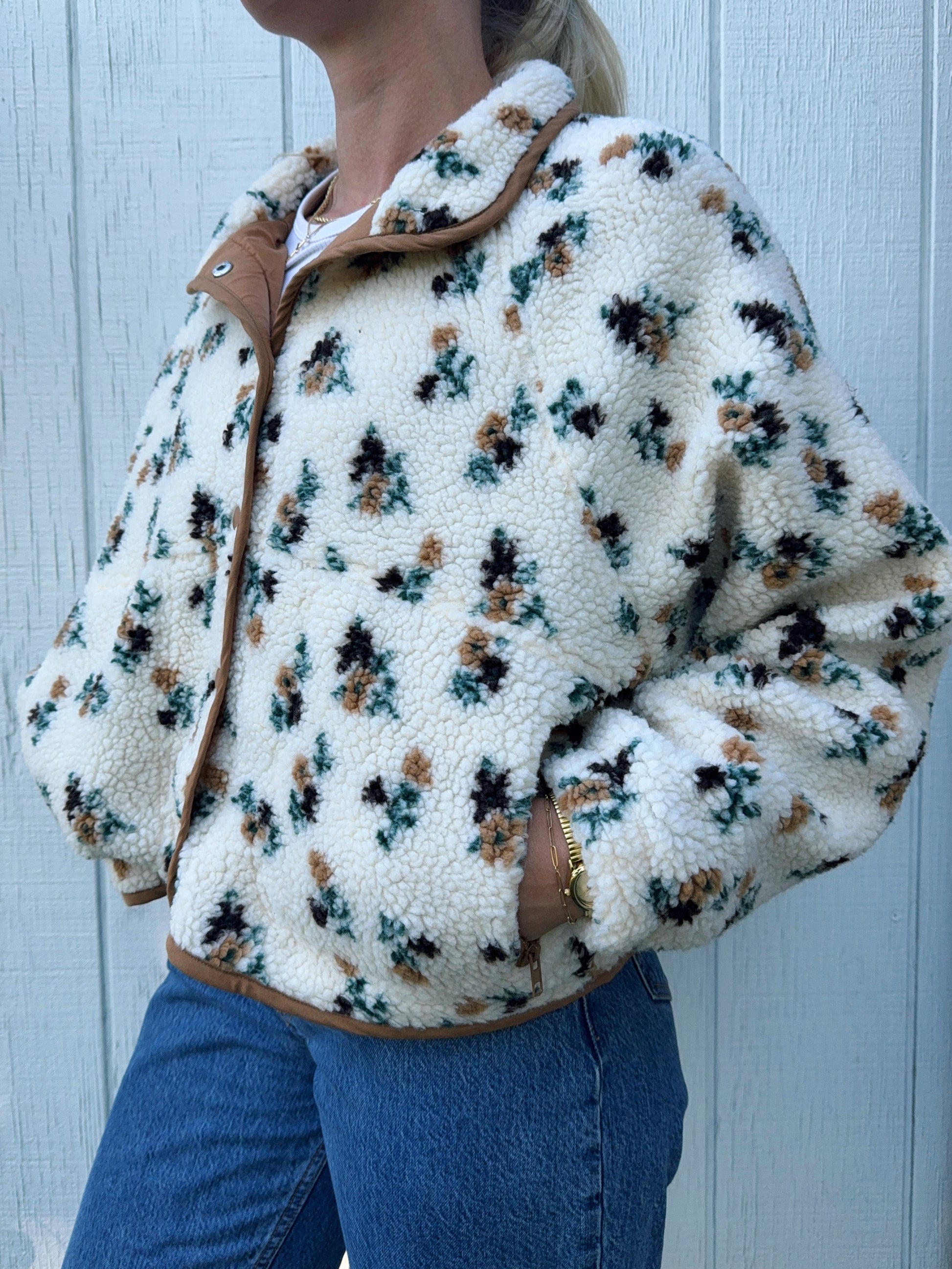 Cream and Caramel Floral Sherpa Button up Jacket! Includes Pockets. Runs true to Size. Lily is 5'7" and is wearing a Small.
