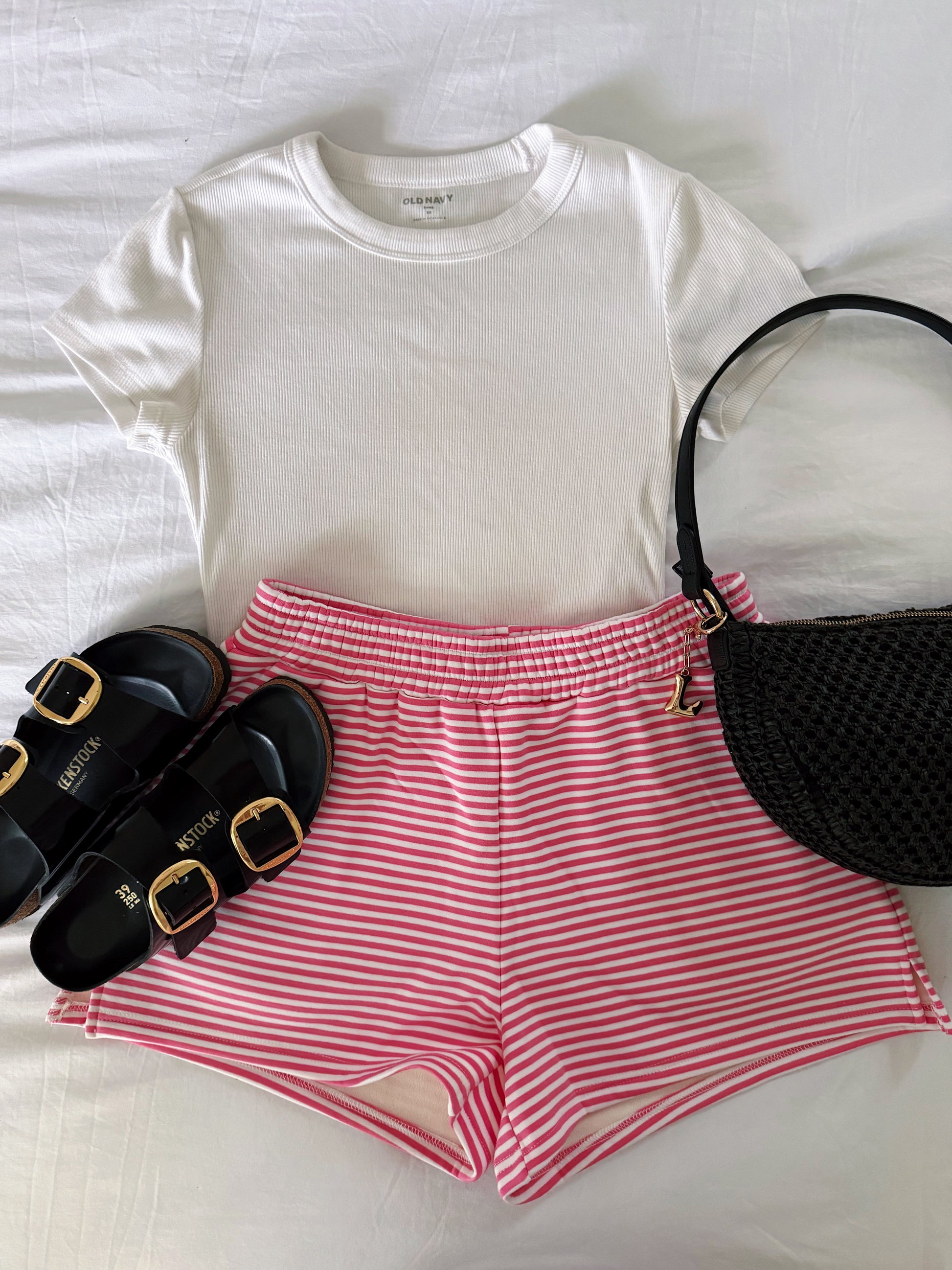 Pink and White Striped Sweatshorts! Runs true to size. Lily is 5'7" and is wearing a Size Medium.