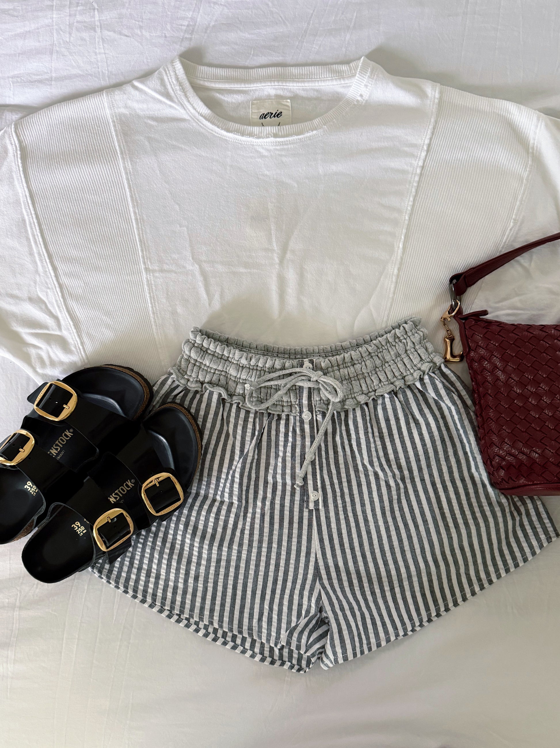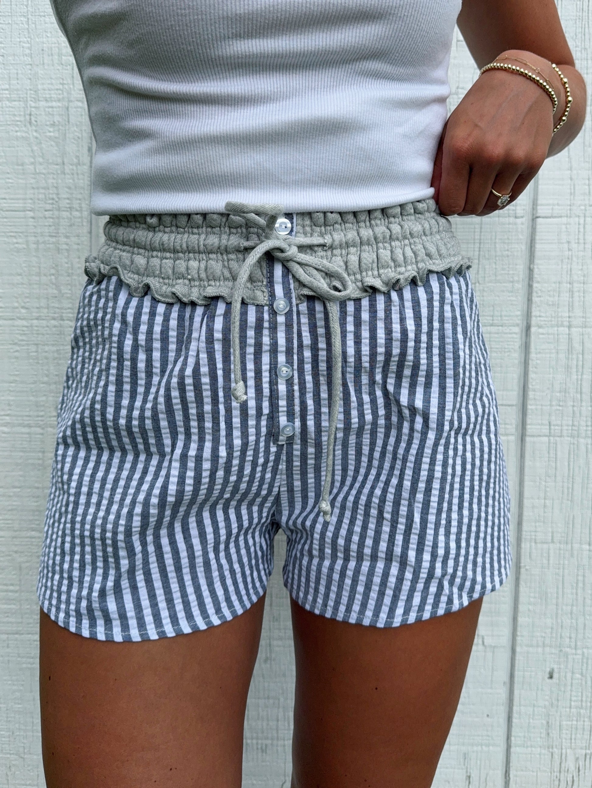 Gray and White Linen high-waisted striped shorts with heather gray waistband and adjustable ties! Runs slightly small- Lily is 5'7" and is wearing a Size Medium. It is recommended to size up one size.