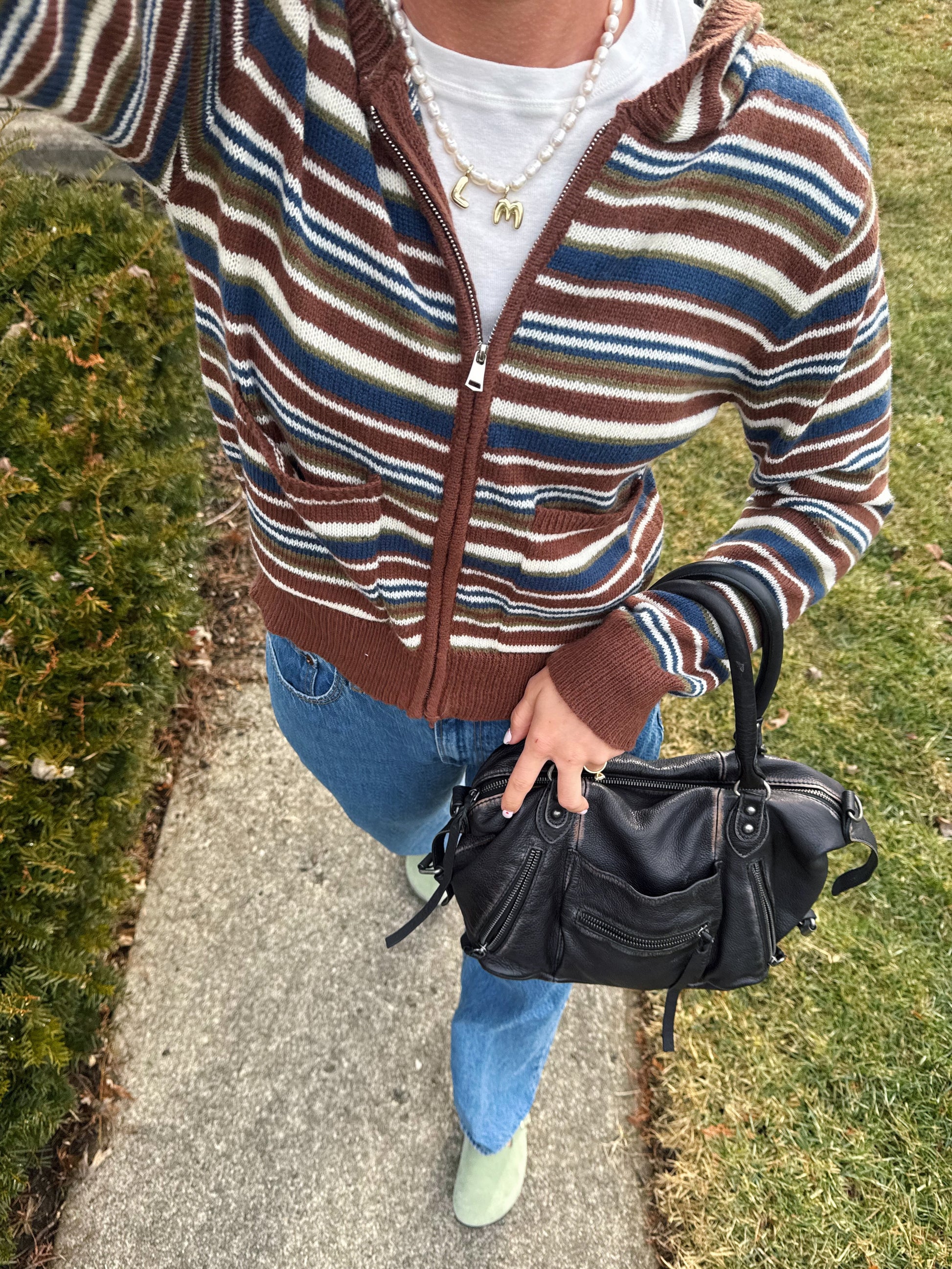 Brown, White, Blue and green striped zip-up hoodie sweater! Fits waist-length and true to size. Lily is 5'7" and is wearing a Small.