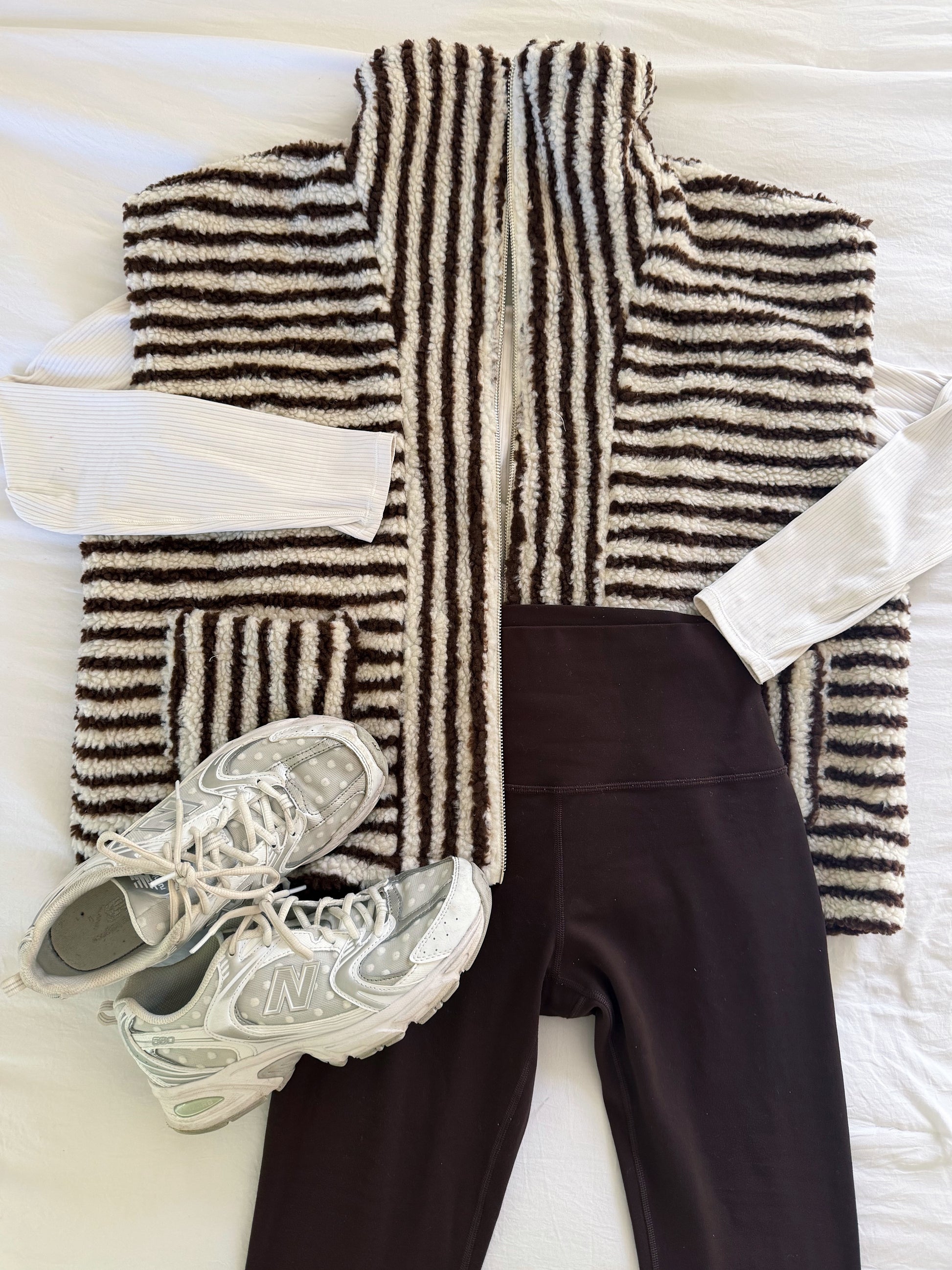 White and Brown Striped Sherpa vest! Includes pockets, a silver zipper and funnel neck. Runs slightly oversized. Lily is 5'7" and is wearing a Size Medium.