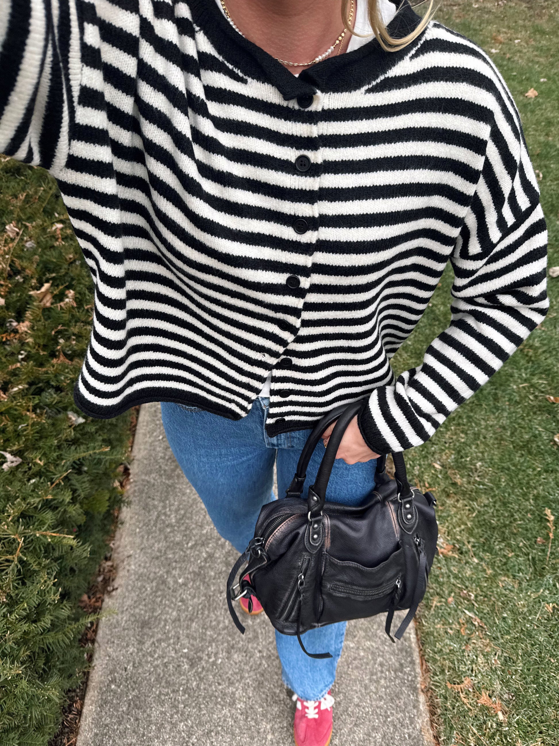Black and White striped cardigan! Fits slightly Overszied. Lily is 5'7" and she is wearing a Size Small.