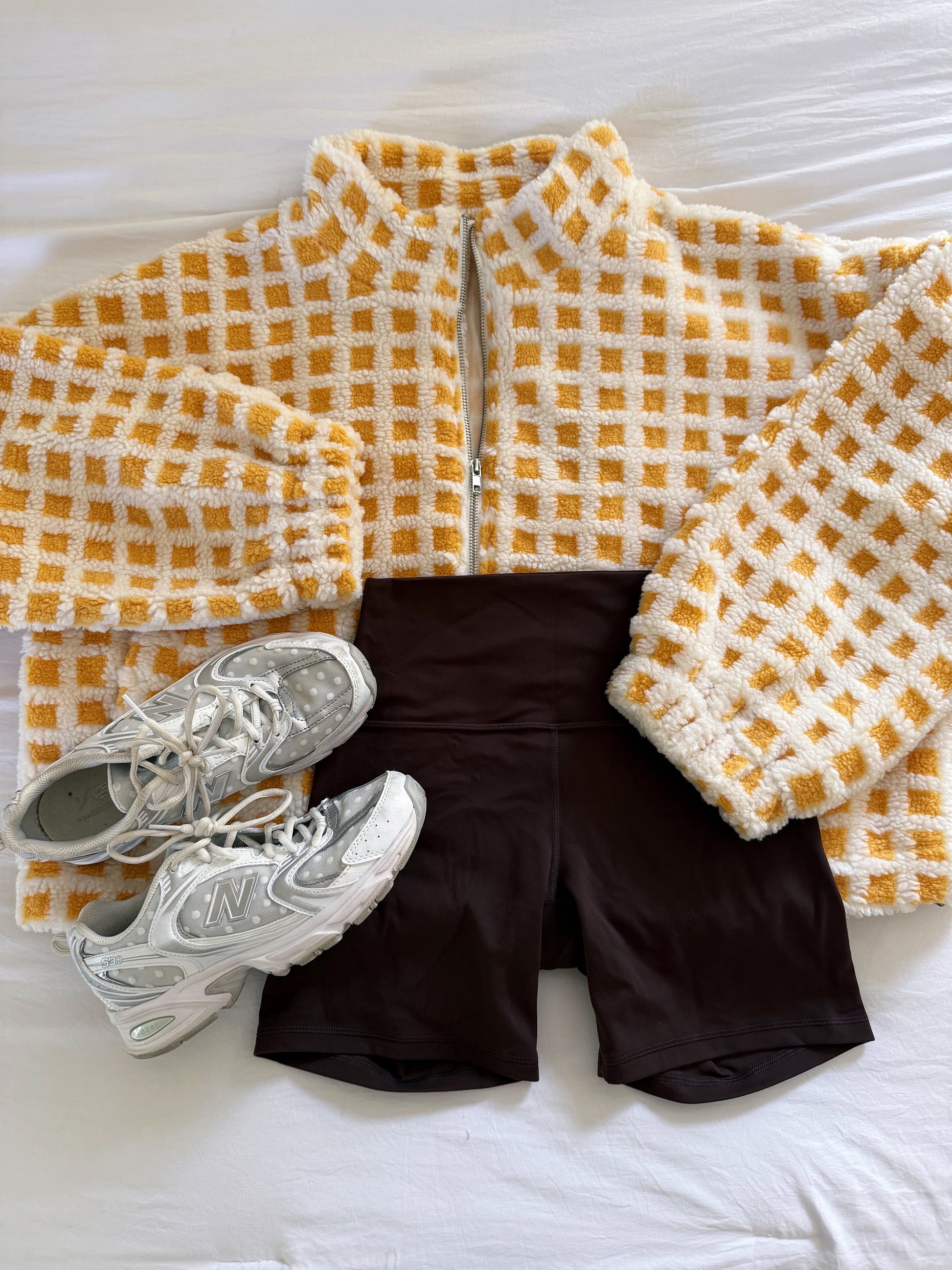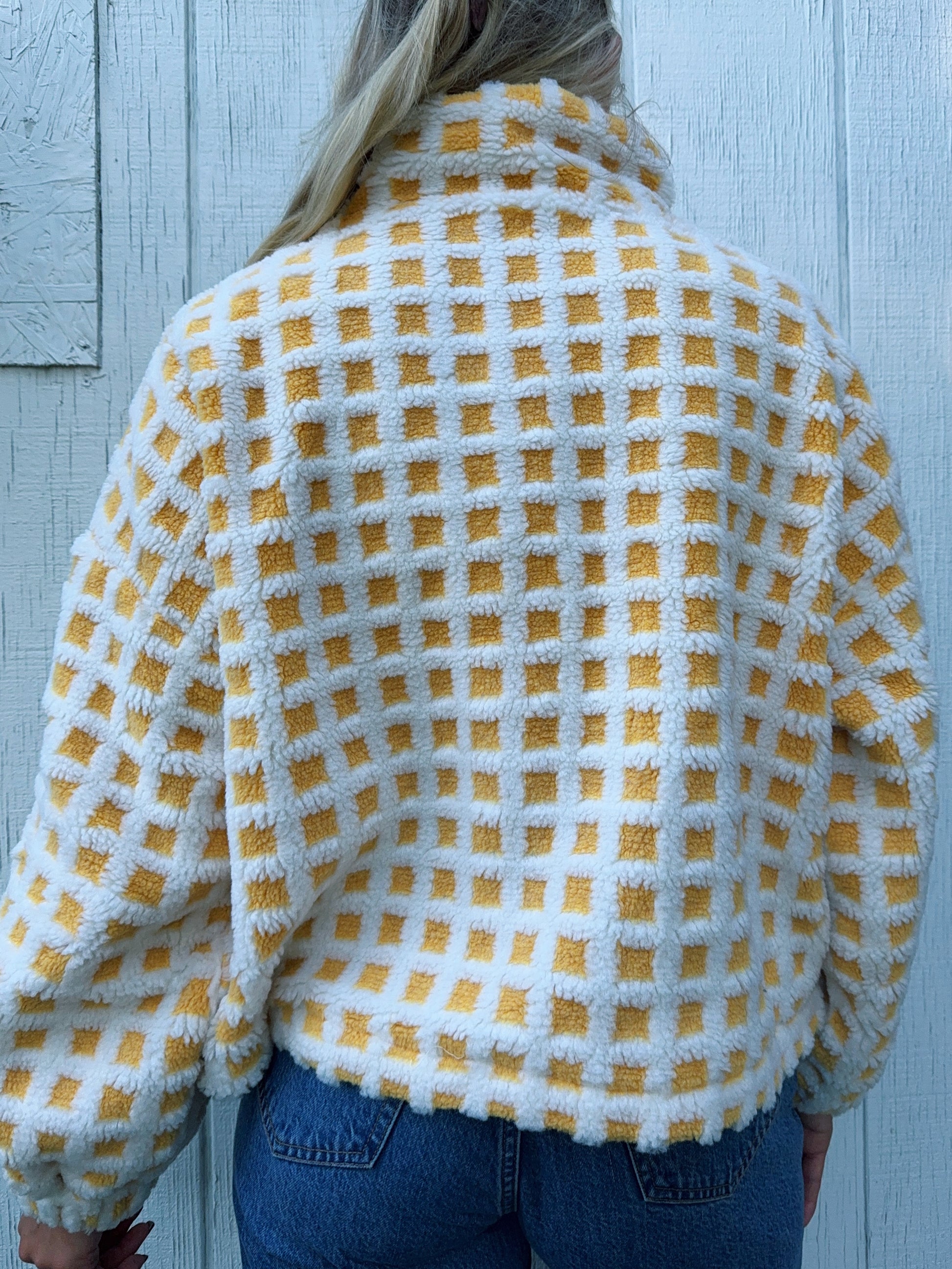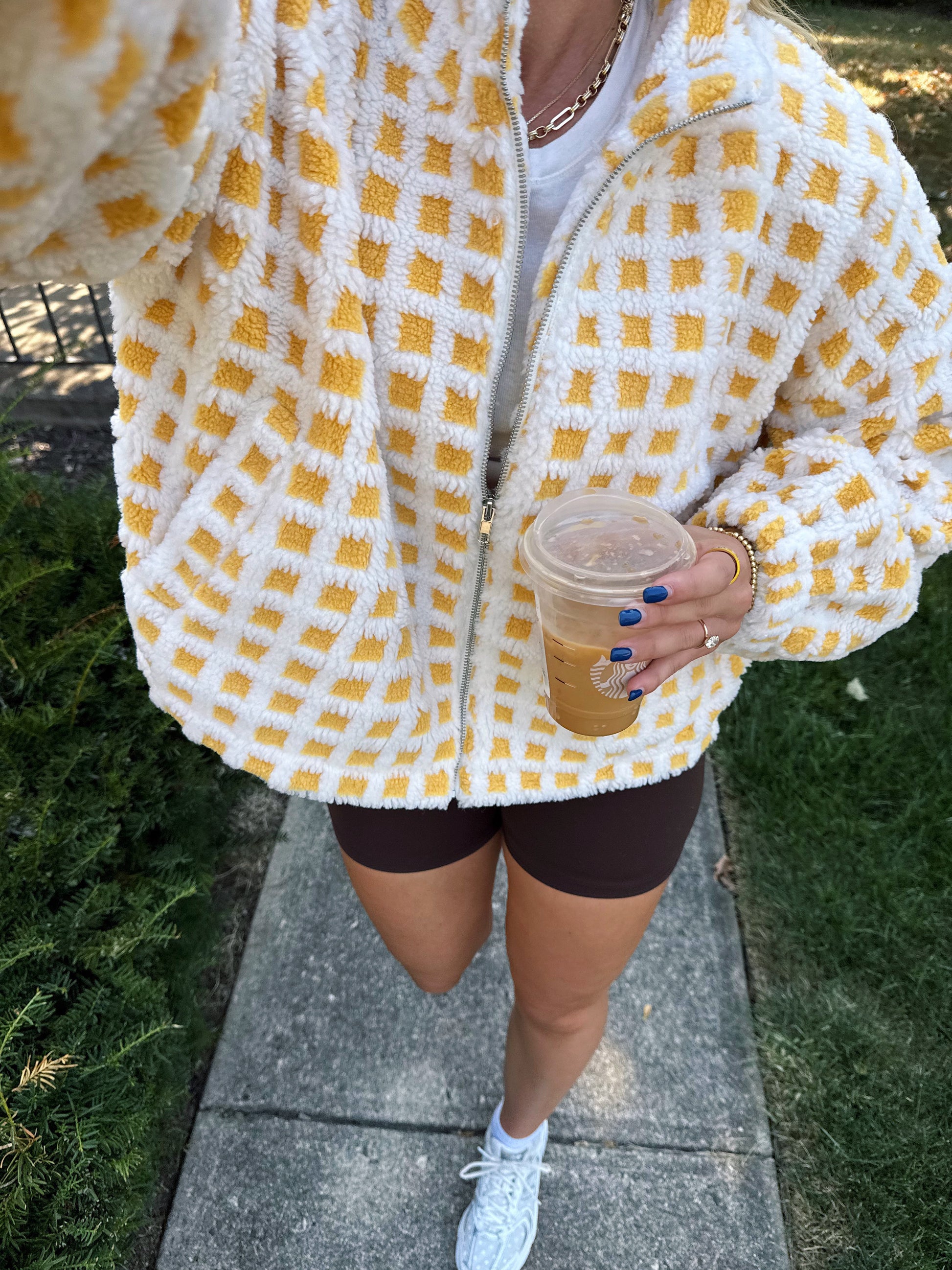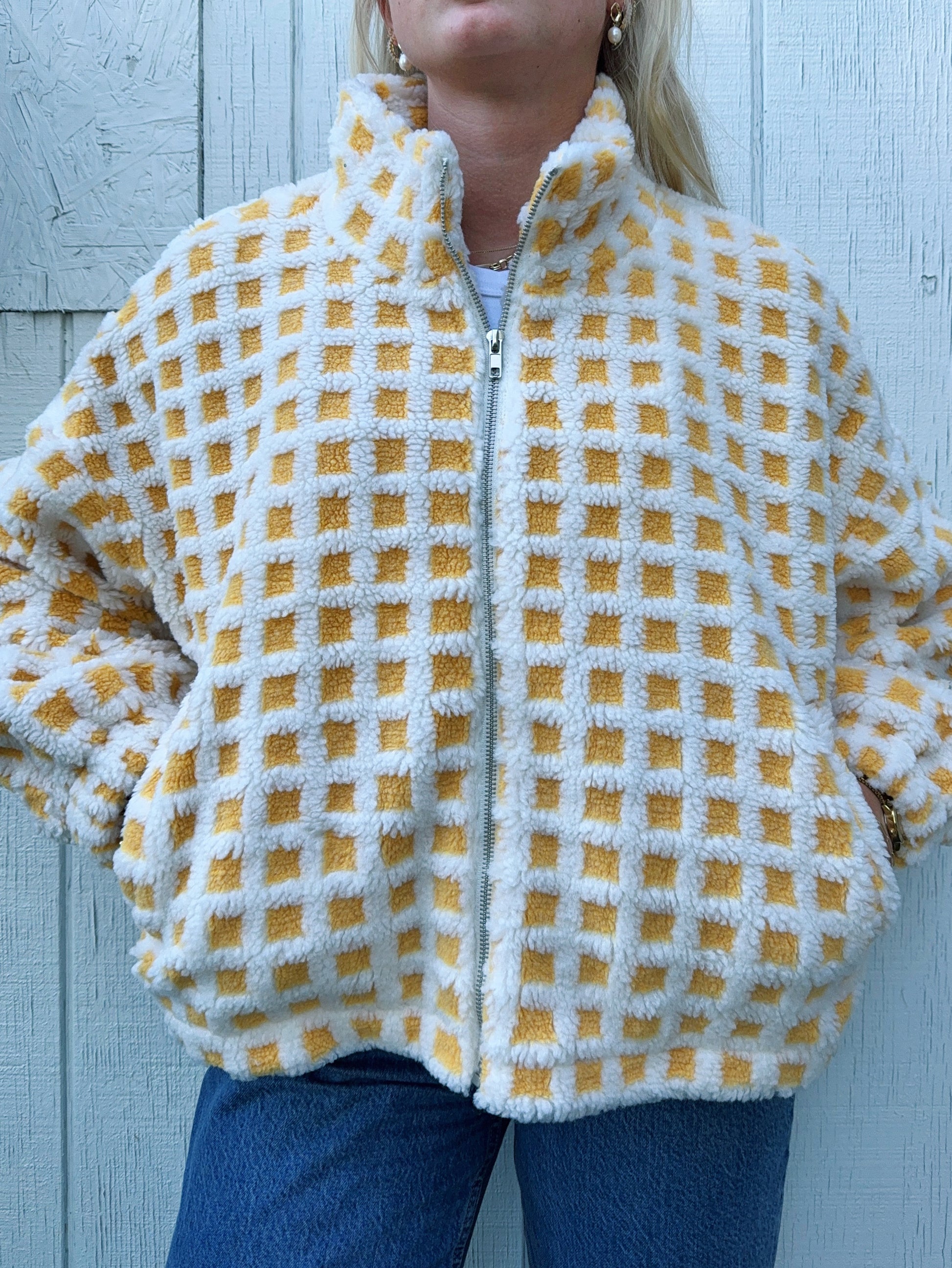 Yellow and cream Oversized Checkered Sherpa Jacket! Runs Oversized. Lily is 5'7" and is wearing a Small.