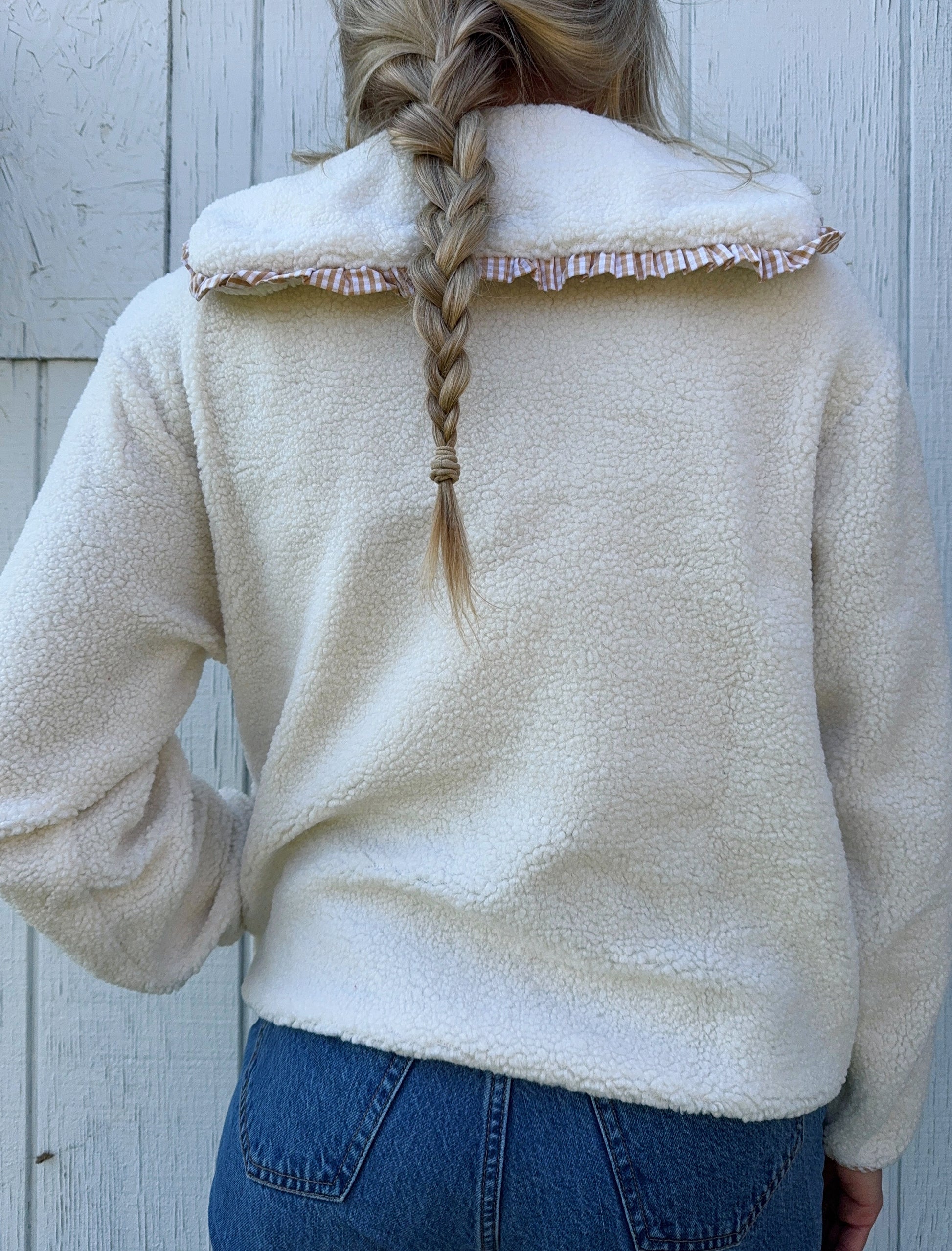 Lightweight Cream Button-up Sherpa jacket with gingham details. Fits slightly Oversized- Inside is lined without the fleece. Lily is 5'7" and is wearing a Small!