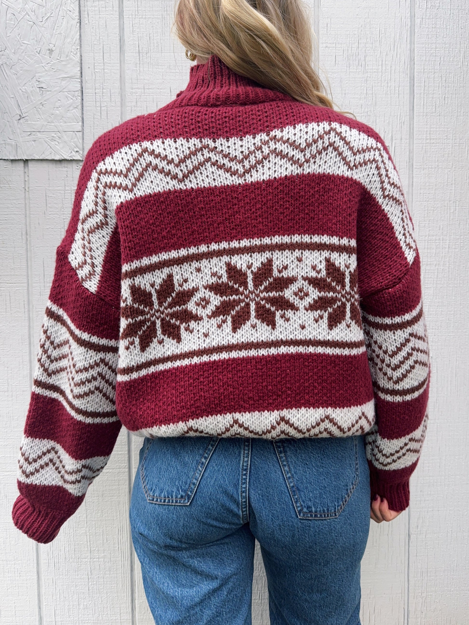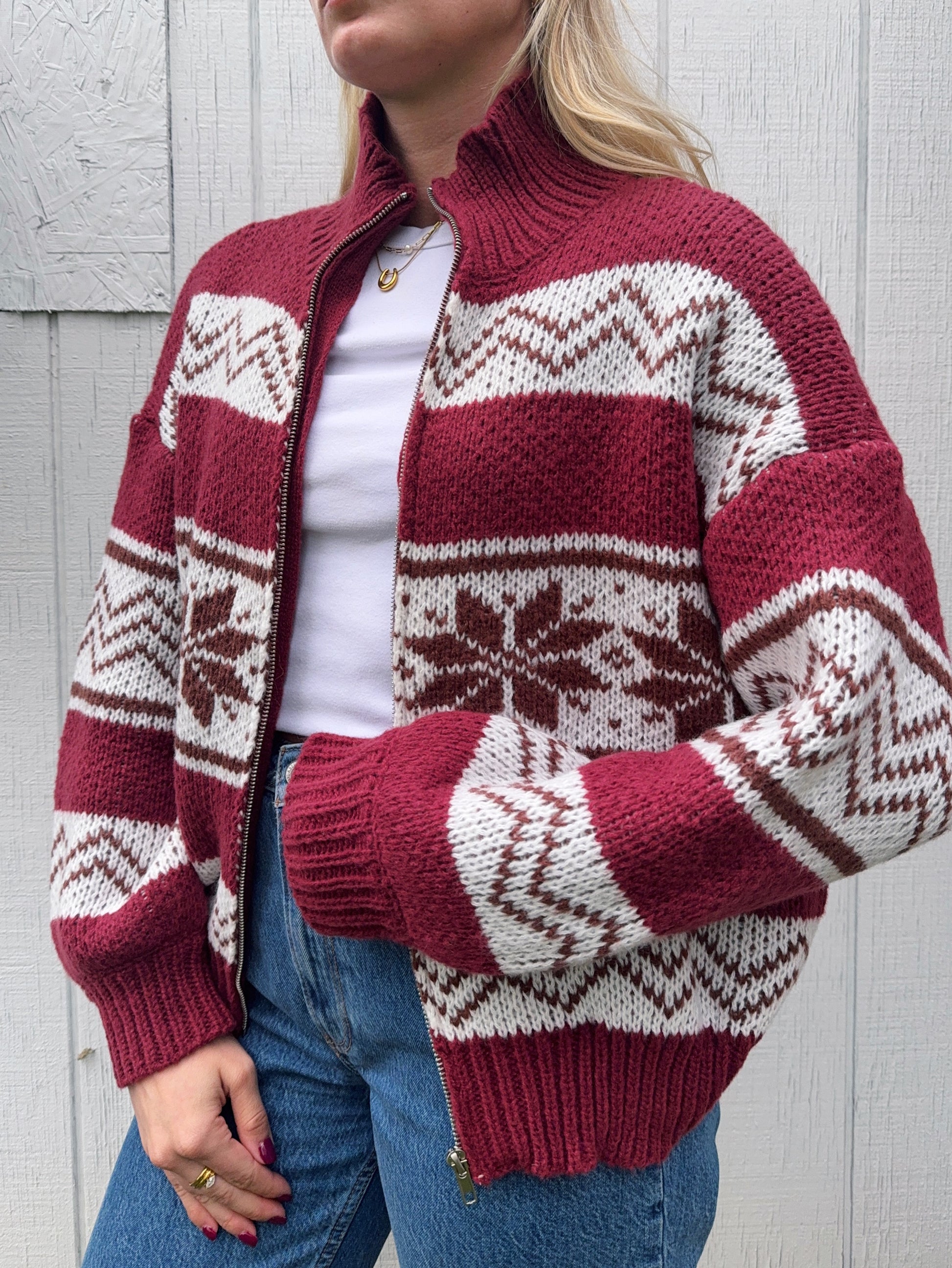 Maroon and White Printed Snowflake Vintage Zip-up Cardigan. Fits slightly Oversized. Lily is 5'7" and is wearing a Size Small.