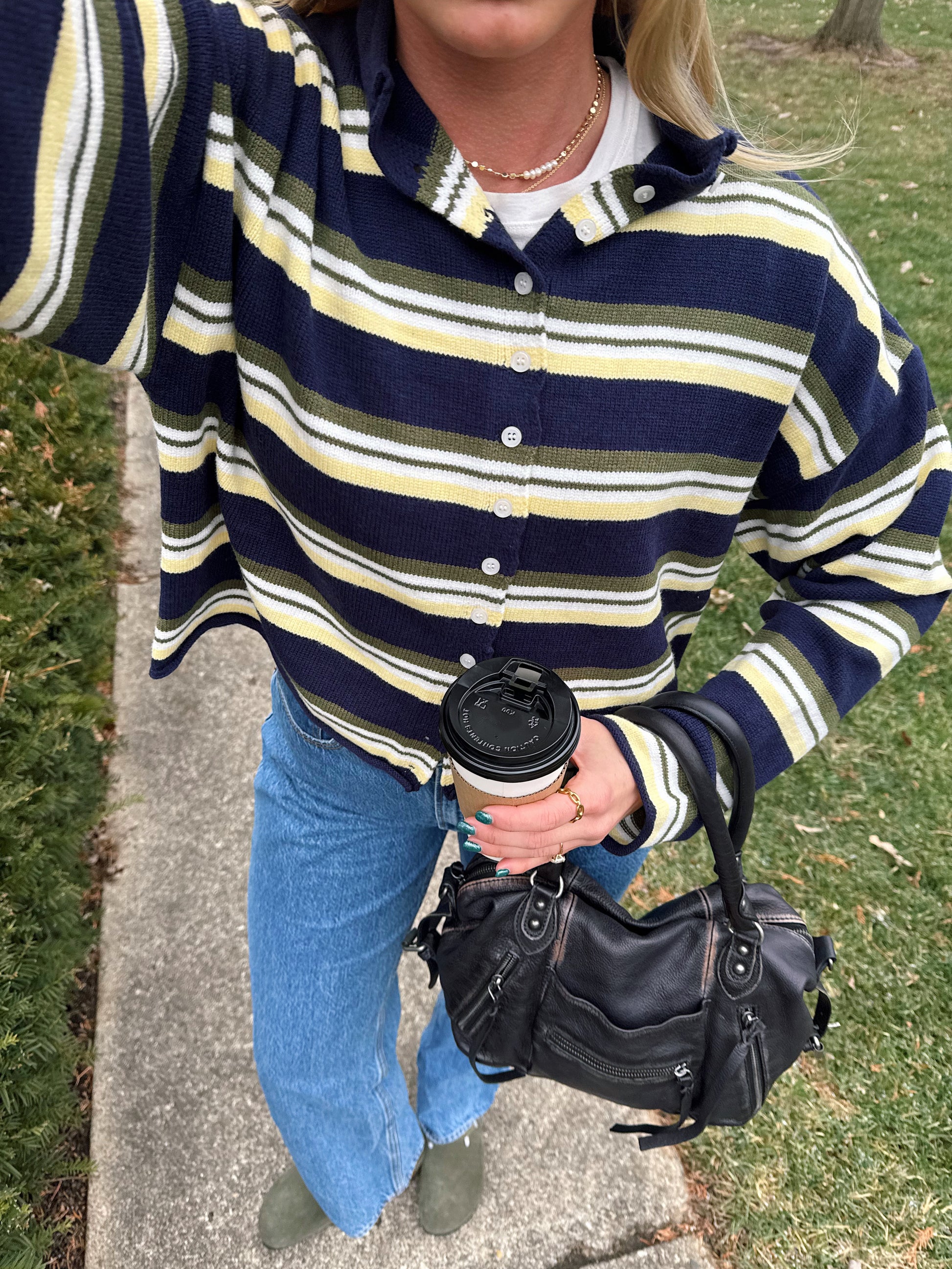 Navy, Butter Yellow, White, and Green striped button-up cardigan sweater! Has a slight mockneck and fits slightly Oversized. Lily is 5'7" and is wearing a Small.